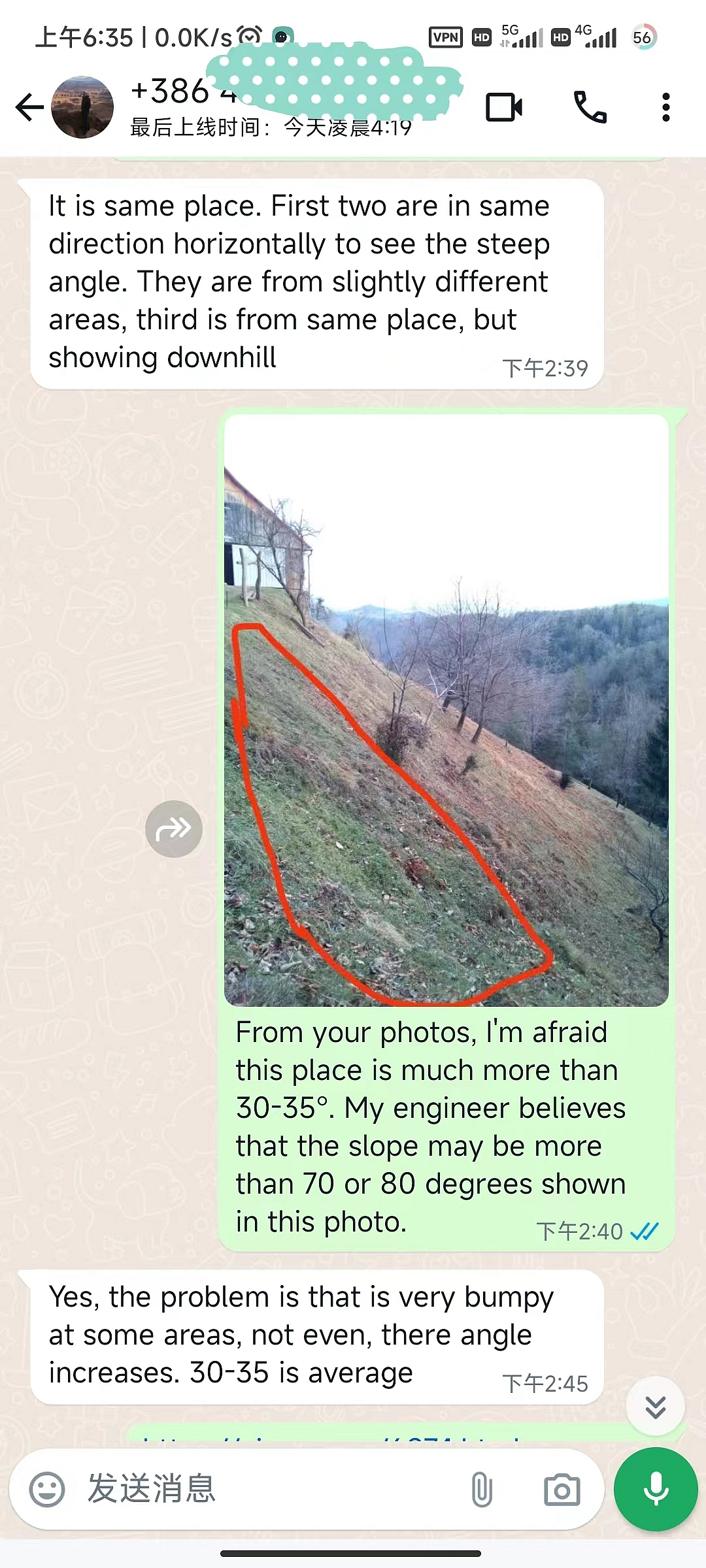 Upon reviewing photos and discussing the slope’s steepness, we expressed our honest assessment that some areas may also be too challenging for our machine to handle.