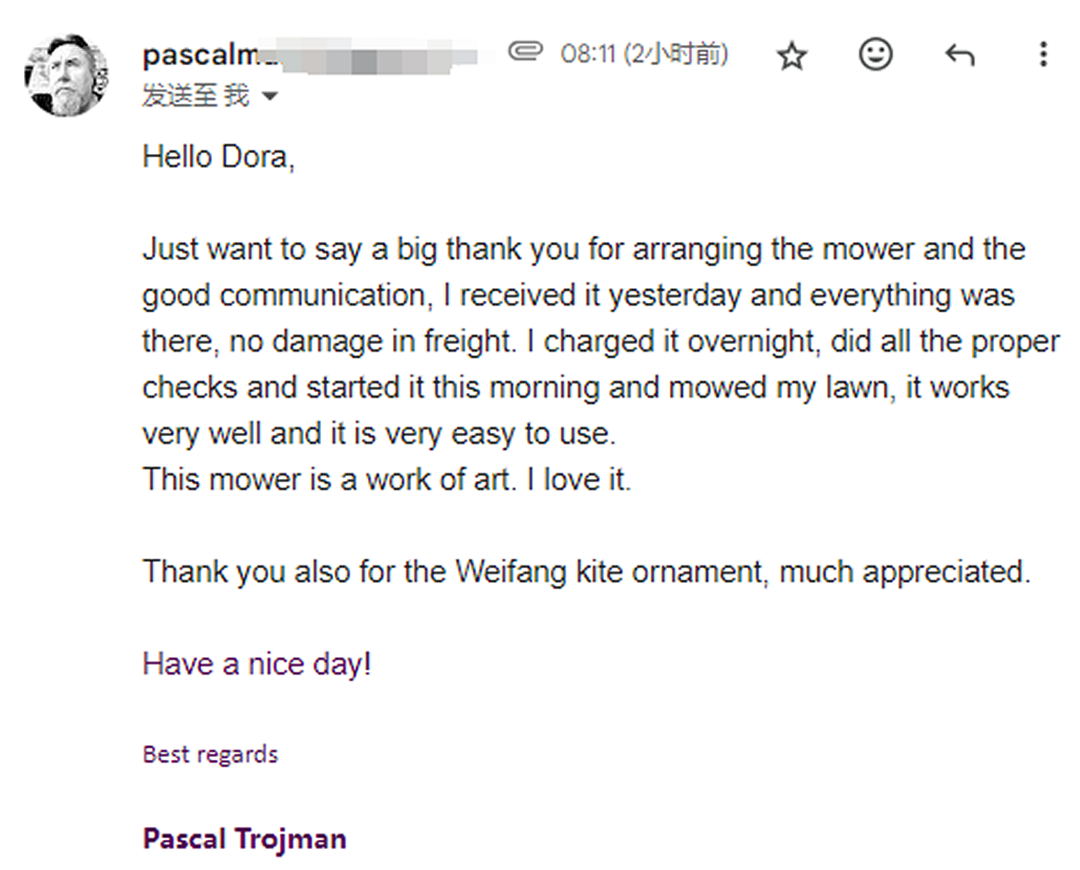 In the world of customer service, there are moments that stand out—moments when all the pieces align, and satisfaction blooms. Such was the case when Pascal Trojman, an esteemed client from Australia, reached out with glowing feedback after receiving our mower.