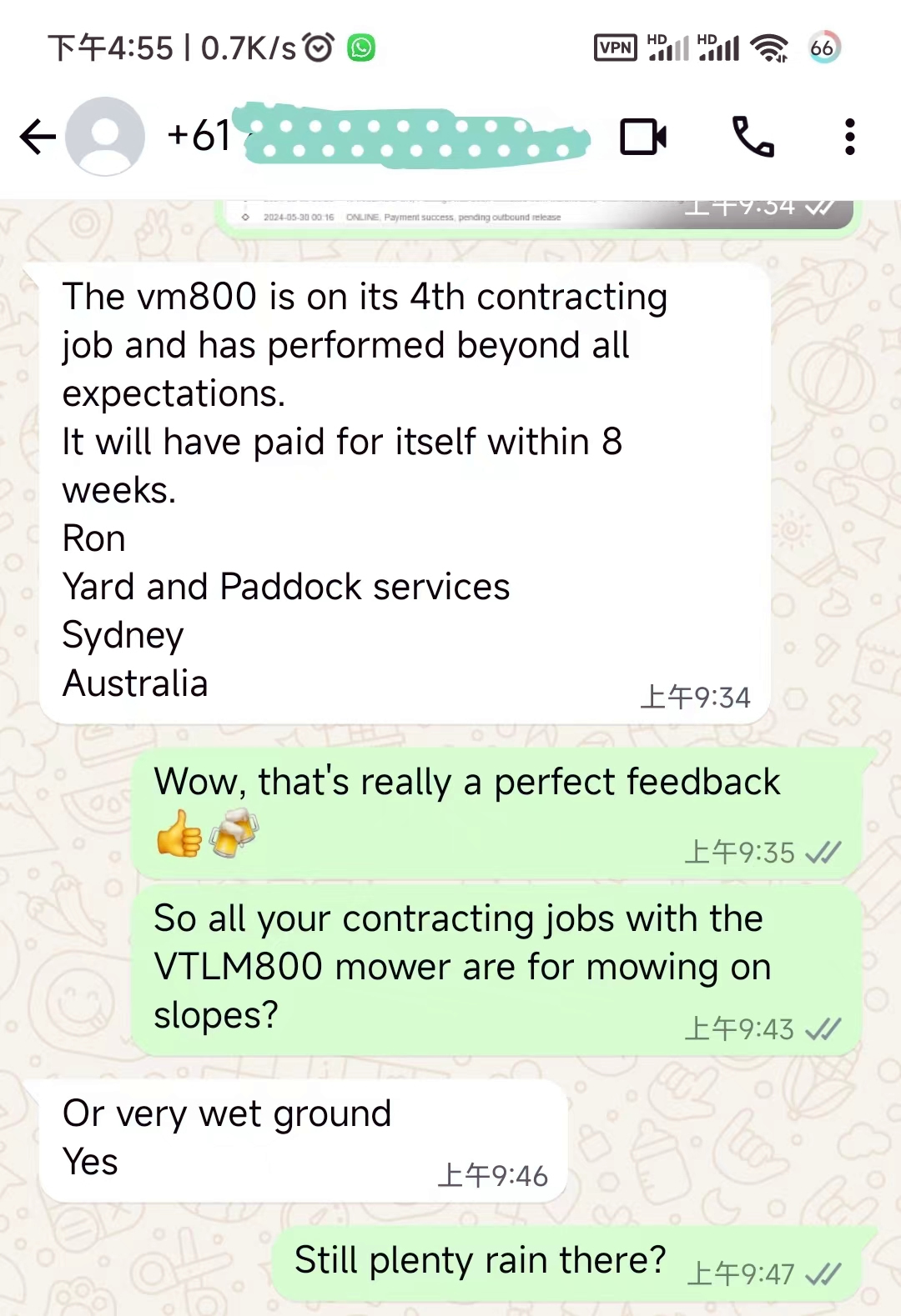 In recent communications with our Australian client Ron, we were thrilled to hear his feedback on our VTLM800 mower: