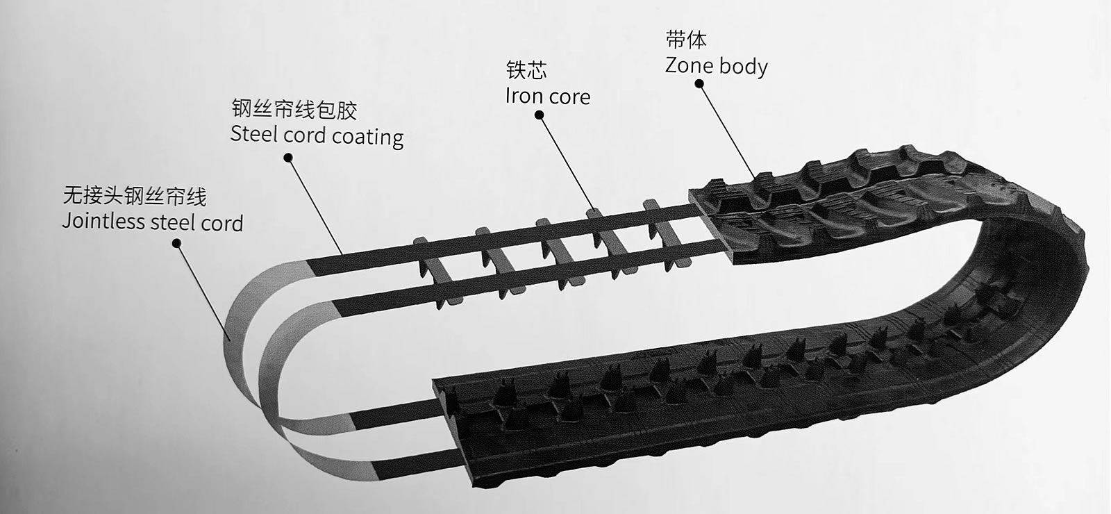 The internal structure features a steel frame, while the exterior rubber track is engineered according to principles of construction, ensuring wear resistance and long-lasting performance.