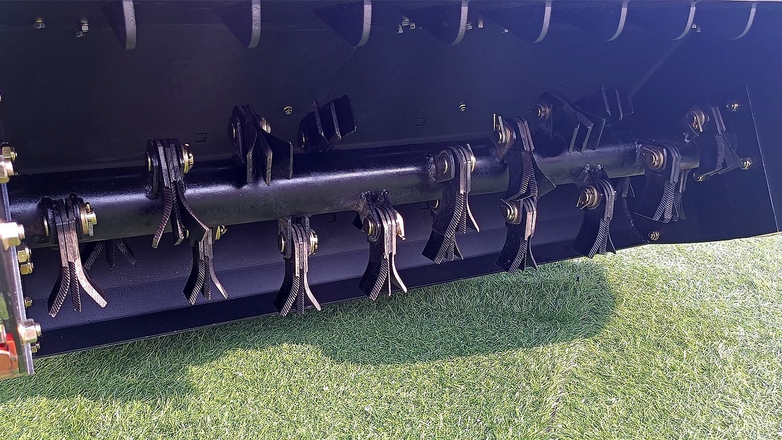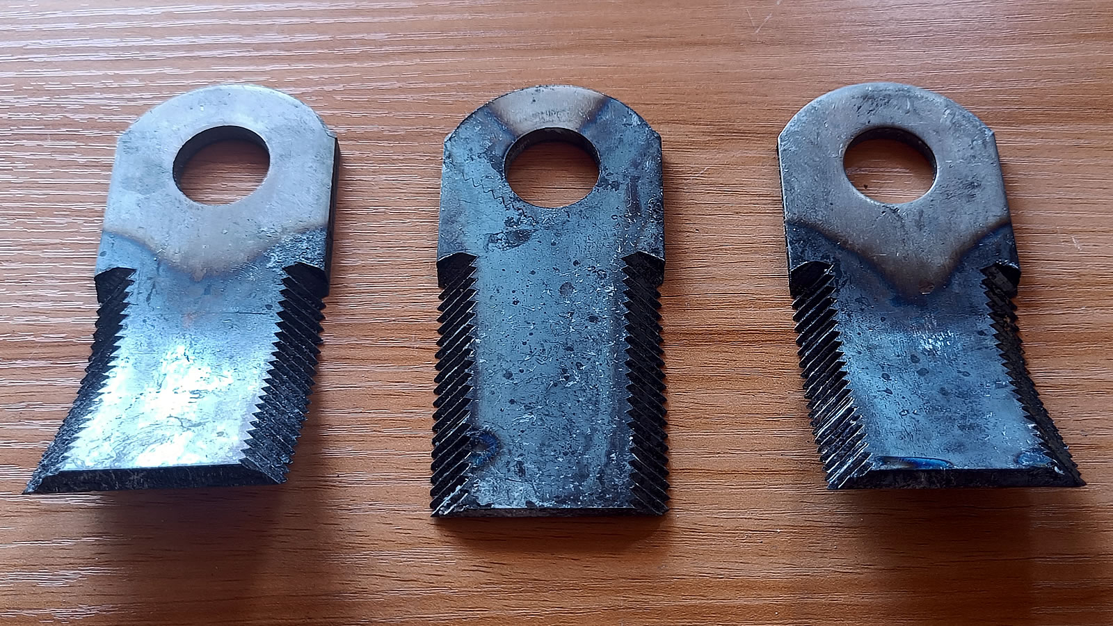 Their serrated cutting edges are designed to prevent grass from sticking during mowing, especially fresh grass.