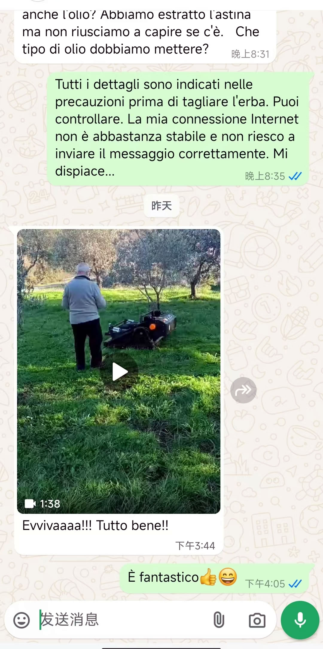 The customer shared his satisfaction with our service and sent us a heartwarming video of his elderly father operating the mower with ease. This testimonial highlights the user-friendly design and outstanding maneuverability of our machines.