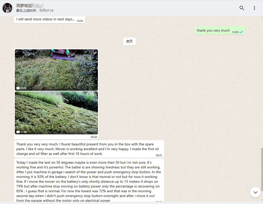 We recently received exciting feedback from our customer in Croatia, who shared a video of the VTLM800 Remote Slope Mower in action—tackling an impressively steep slope with ease. In his message, he expressed great satisfaction with the machine’s performance and the thoughtful gift we included in the spare parts package.