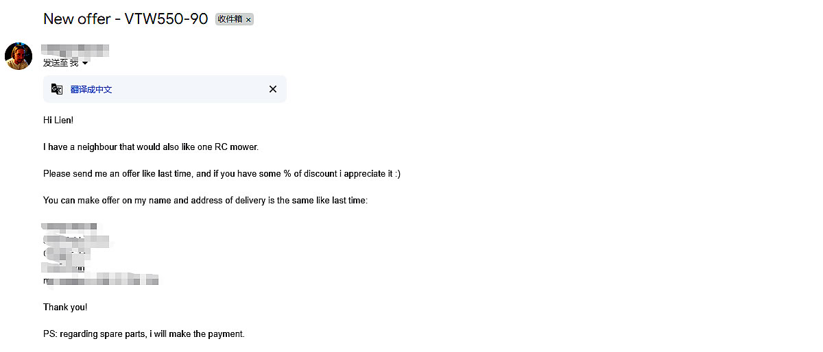 I have a neighbour that would also like one RC mower. Please send me an offer like last time.”
