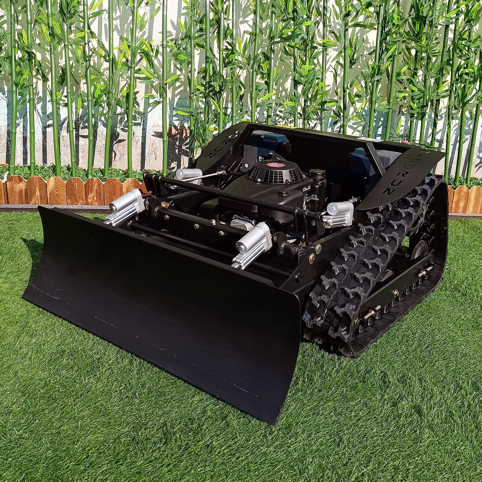 Remote mower with Loncin electric start gasoline engine 4.5Kw, 2 pcs 24V 500W servo control walking motors, 73% high transmission efficiency micro gear reducer, 28V 1500W dynamo that can ensure charging while working, 98cm width snow plow.