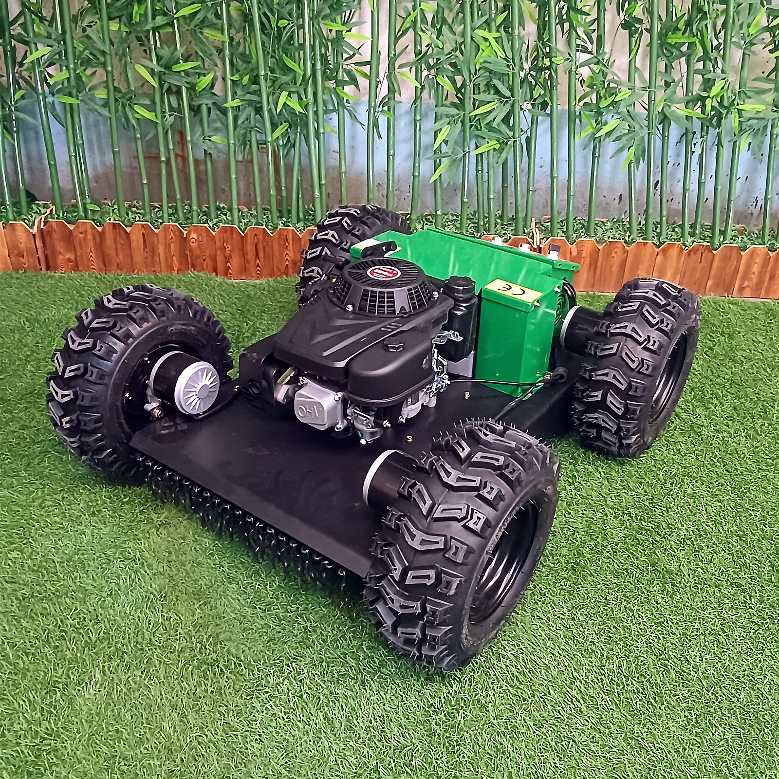 Compared to the standard model, this custom version is green, and uses larger, wider tubeless tires, allowing for a higher mowing height and simpler tire maintenance.